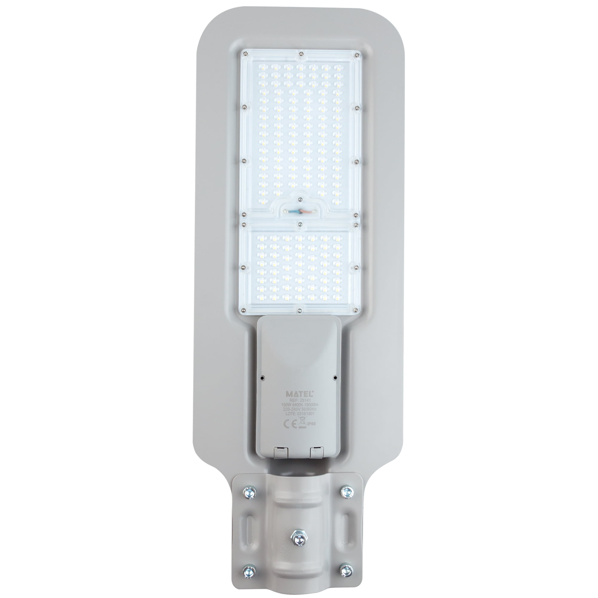 Farola LED de 150W, con cuerpo en aluminio fundido plata y cubierta clara de alta resistencia.