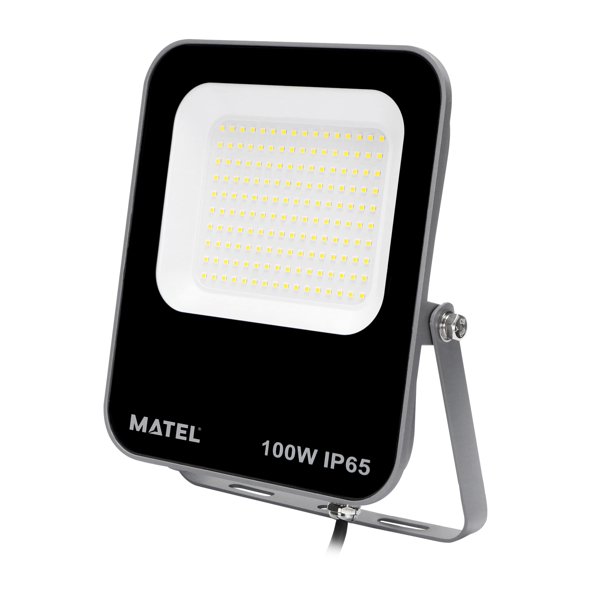Versión de 100W con luz fría 6500K, chip Samsung de alto rendimiento, IP65, carcasa de aluminio gris y válvula de ventilación. Eficiencia y resistencia exterior.